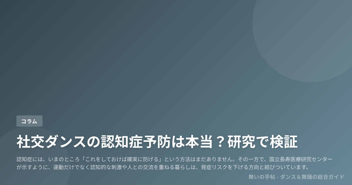 この記事では、社交ダンスに期待できるのは認知機能の維持・改善に関する報告までであり、認知症の発症予防そのものはまだ断言できない、その境界線をきちんと分けて見ていきます。