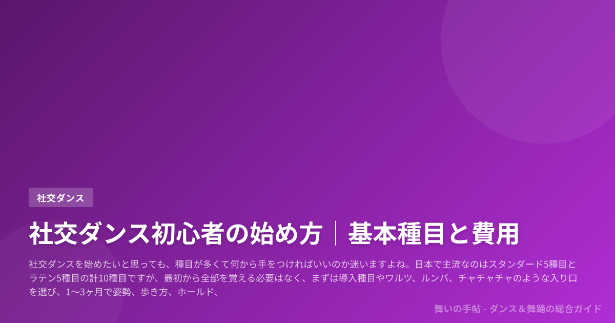 日本で主流なのはスタンダード5種目とラテン5種目の計10種目ですが、最初から全部を覚える必要はなく、まずは導入種目やワルツ、ルンバ、チャチャチャのような入り口を選び、1〜3ヶ月で姿勢、歩き方、ホールド、リズムの土台を作るのが遠回りに見えていちばん確実です。