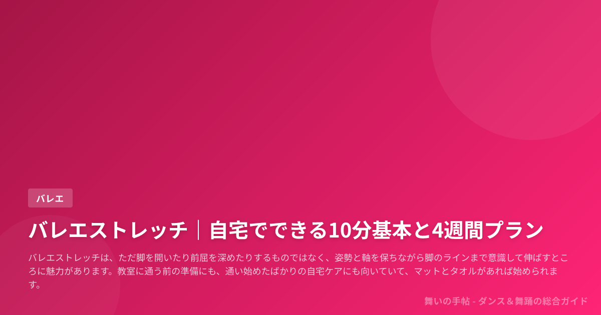 この記事では、ハルメクが紹介するようなバレエストレッチの基本的な考え方や、e-ヘルスネットでも示されている安全の原則を土台に、基本7種の手順、動的・静的の使い分け、10分・15分の自宅ルーティン、4週間で続ける組み立て方まで、順を追って整理していきます。
